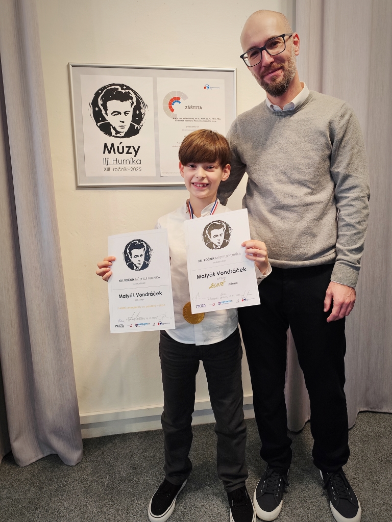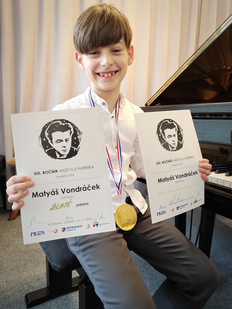 Múzy Ilji Hurníka 2025 představují již XIII. ročník prestižních soutěžních přehlídek rozdělených do několika uměleckých oborů a dává prostor talentům nejen z České republiky. Naše škola měla zastoupení v hudební přehlídce, jež se konala ve dnech 15. a 16. listopadu. Matyáš Vondráček, žák 2. ročníku hry na klavír, si se svým učitelem Petrem Vondráčkem připravili soutěžní program, který je výhradně zaměřený na interpretaci hudby 20. a 21. století a zároveň je povinná alespoň 1 skladba českého autora. Vše vyšlo na jedničku. Matyáš v Ostravě získal zlaté pásmo a zároveň si od odborné poroty odnesl zvláštní cenu za poutavý výkon! Blahopřejeme! Více fotografií v Galerii.